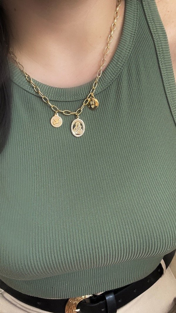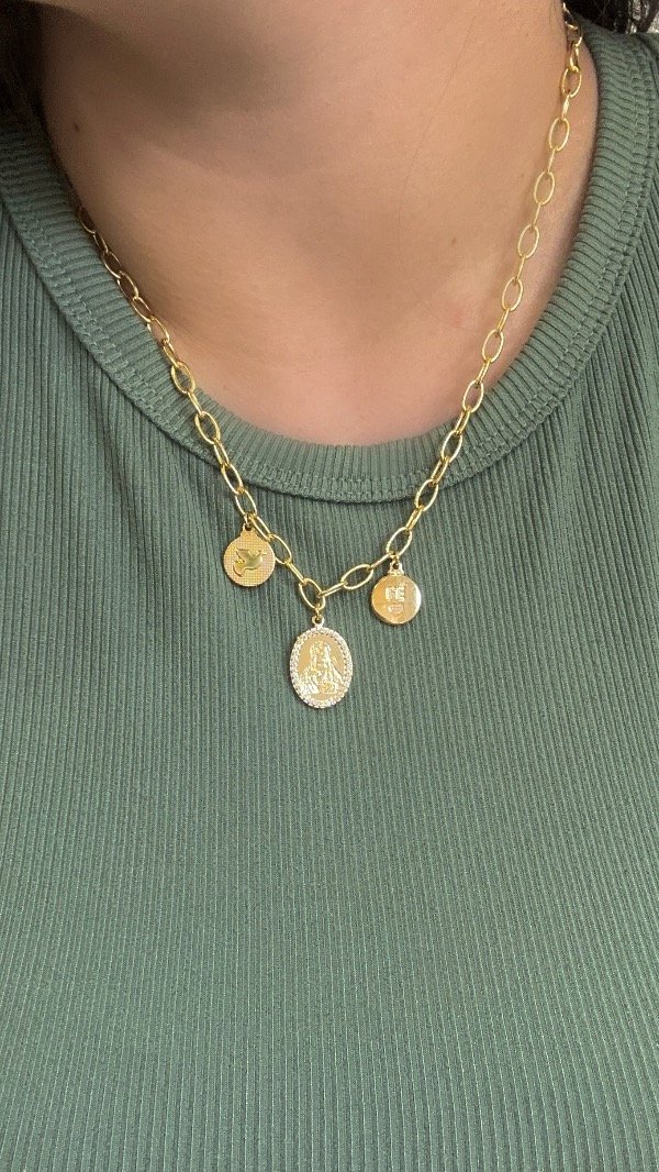 Gargantilla religiosa con dijes de espíritu Santo, Viegen y Fé laminado en oro 18k
